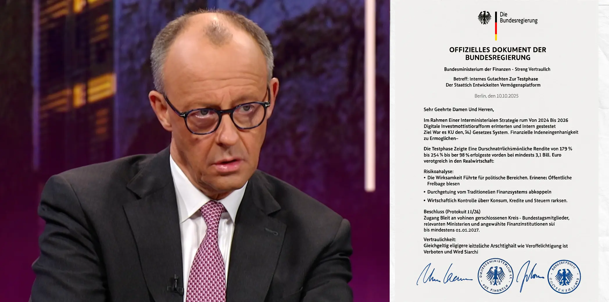 📢 Friedrich Merz: „Es ist … eine KI-basierte Plattform. Sie analysiert Märkte und führt automatisch Transaktionen aus. Funktioniert ohne menschliches Zutun. Wir haben sie gemeinsam mit mehreren Banken getestet. – Die Rendite … war enorm. zwischen 20 und 30 % monatlich. – Wir hatten Angst, dass ein massenhafter Zugang das gesamte Finanzsystem destabilisieren würde.“